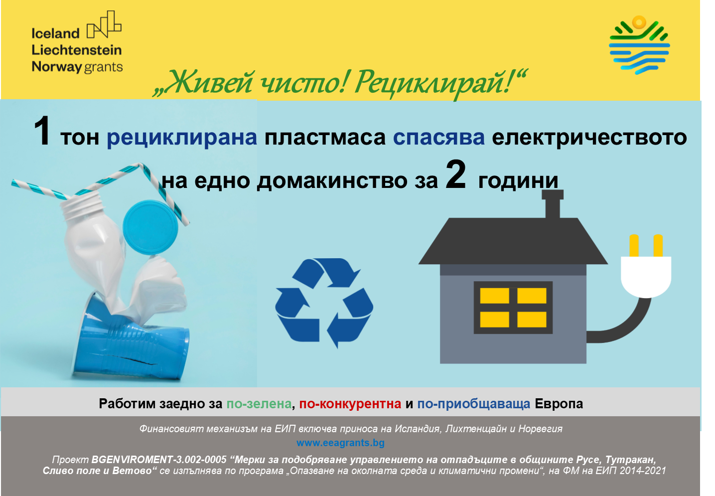 Този документ е създаден в рамките на проект BGENVIRONMENT-3.002-0005 ,,Мерки за подобряване управлението на отпадъците в общините Русе, Тутракан, Сливо поле и Ветово’’, който се осъществява с финансовата подкрепа на Програма ,,Опазване на околната среда и климатични промени’’, чрез ФМ на ЕИП 2014-2020 г. Цялата отговорност за съдържанието на публикацията се носи от Община Русе и при никакви обстоятелства не може да се счита, че този документ отразява официалното становище на Програмния оператор и/или Офиса на Финансовия механизъм“.